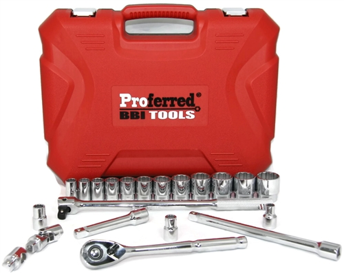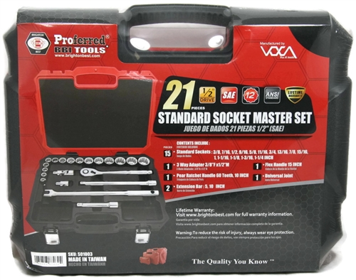 21 Piece 1/2" Drive SAE 12 Point Master Socket Set featuring a stress reduced hex drive. This set includes a variety of standard sizes with a 1/2" drive. With a lifetime warranty, this is a product that is built to last. Packaged in a durable carrying case.