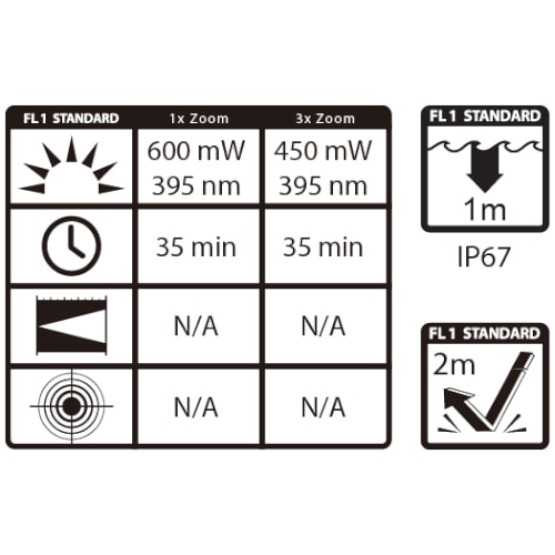 LED Brightness (Radiant Flux) | 600 mW (1X Zoom), 450 mW (3X Zoom) |