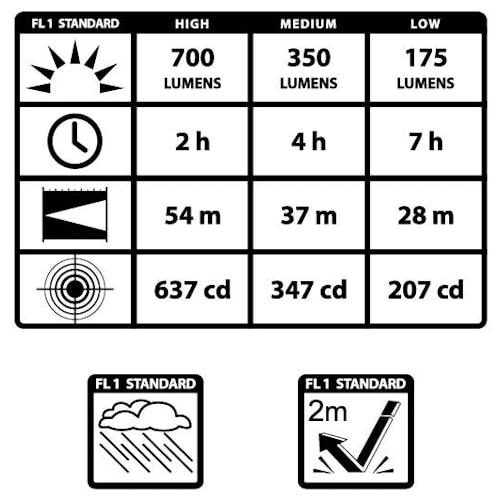 LED Brightness (Luminous Flux) | 700 Lumens (High), 350 Lumens (Medium), 175 Lumens (Low), 150 Lumens (Top) |
