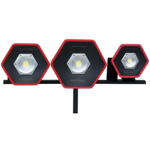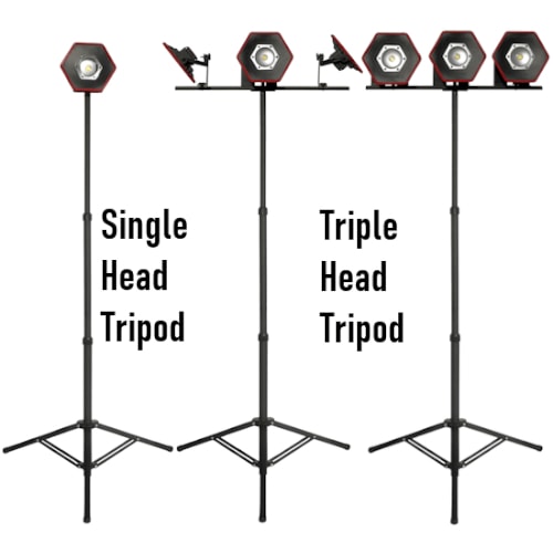 The Triple Head Telescopic Tripod accepts one, two, or three LUMENATOR® work lights to an included crossbar. The Triple Head Tripod includes 3 mounting brackets so the work lights can be positioned independantly of each other.