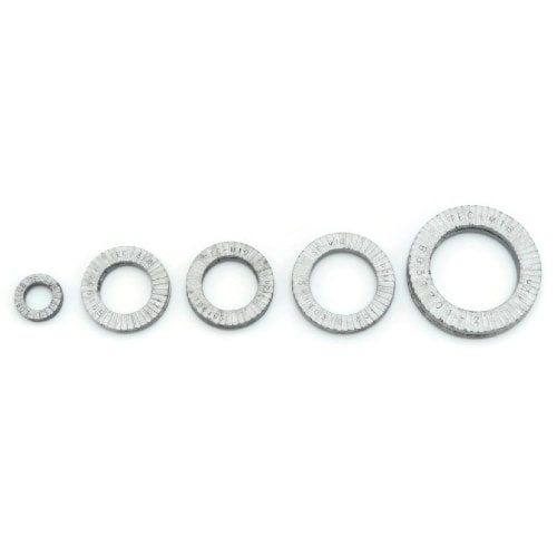 Metric Wedge style lock washers are used in pairs to create an unrivaled locking mechanism beneath the head of a bolt. Unlike more common style metric lock washers that use friction to prevent loosening, wedge style lock washers rely on tension to create a more secure hold. A mild adhesive should be installed between the two metric washers and then added to the fastener assembly beneath the bolt head.