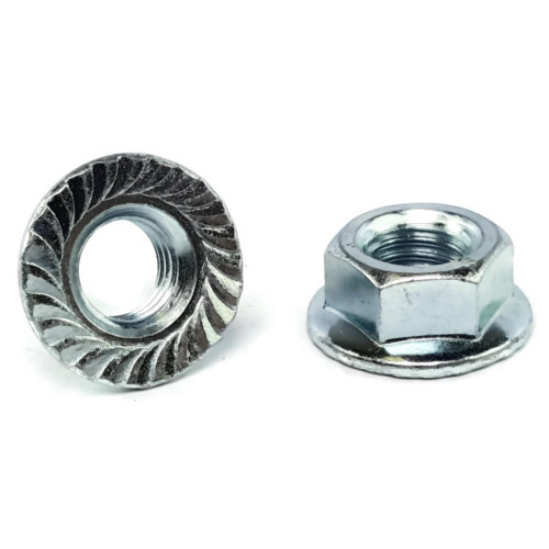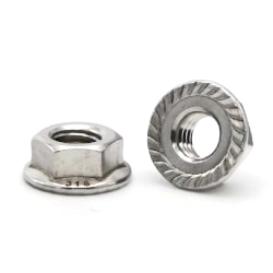 Serrated flange nuts are hex nuts with a wide, built-in bearing surface (the flange) and radial teeth on the underside. The flange spreads clamp load like a washer, while the serrations bite into the mating surface to provide vibration-resistant locking without a separate lock washer.