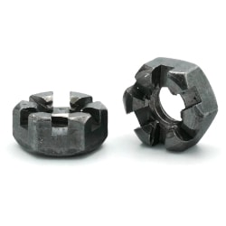 Slotted hex nuts—also called castle nuts—are hex nuts with slots cut into the top face. A cotter pin passes through a slot and the bolt’s cross-hole to create a positive mechanical lock that resists rotation in high-vibration or safety-critical assemblies.