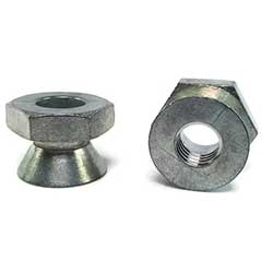 Shear Nuts are conical nuts designed for a permanent installation where preventing tampering with the fastener assembly is important. The conical section is topped by a thin, threadless, standard hex nut that snaps or shears off when the torque exceeds a certain point on the nut. This leaves behind the conical nut, which is very difficult to grip and remove.
