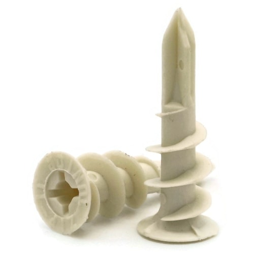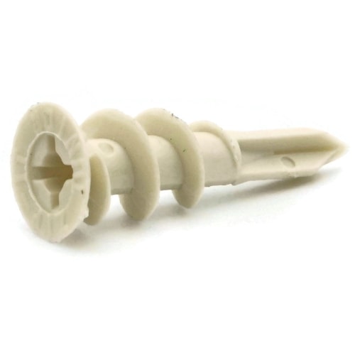 - Deep cutting threads around the anchor body and tapered bottom designed to puncture and drill a hole in the drywall