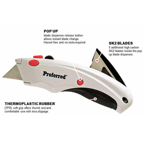 Premium designed utility knives (also commonly called boxcutters) with SK2 high carbon blades for fast and comfortable cutting use. This retractable utility knife features a no-slip TPR grip and a pop-up blade dispenser that holds five blades and allows for instant blade change with no tools required.