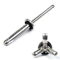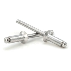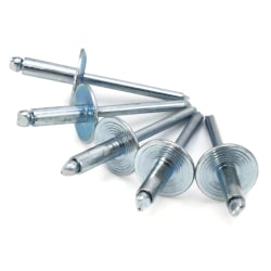 Drill a hole through the materials, insert the rivet, and pull the mandrel with a rivet tool. The mandrel deforms the body to flare behind the joint; when design load is reached, the mandrel snaps at its break point, leaving a set rivet that resists vibration and loosening.