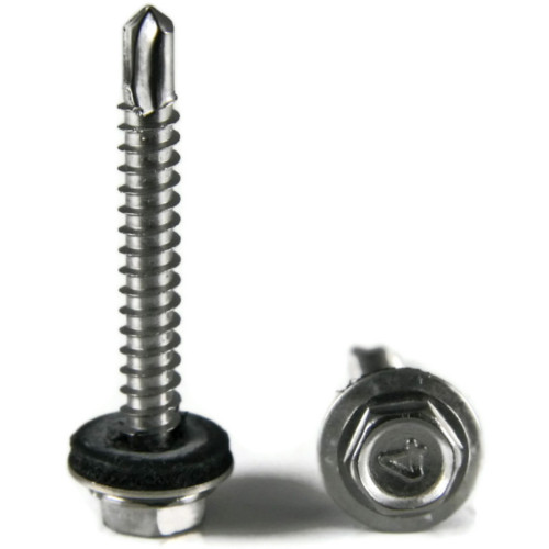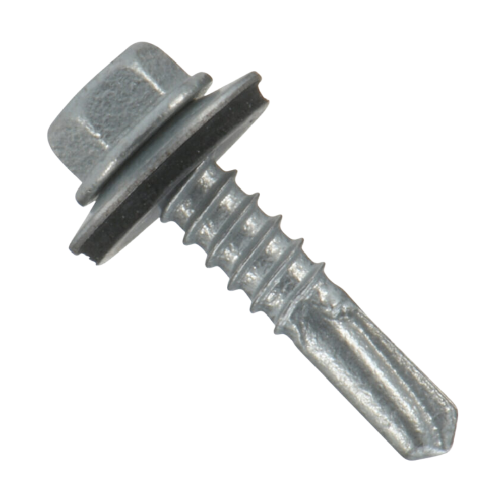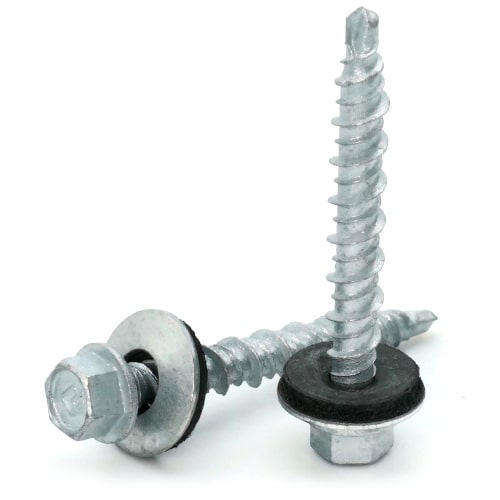 - EPDM sealing washers — UV-stable rubber that compresses under the head to form a weather-tight seal.
