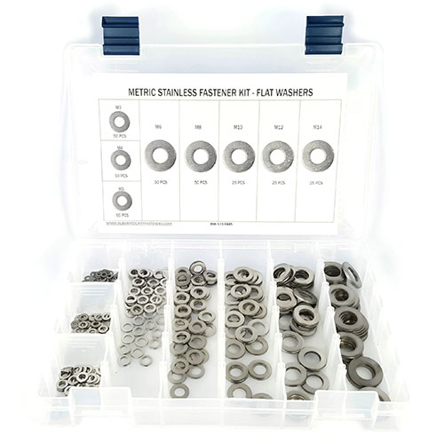 This fastener kit features an assorted, metric sized, A2 Stainless Steel Flat Washer size run in a durable and organized plastic compartment box.