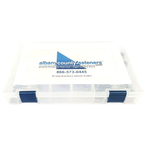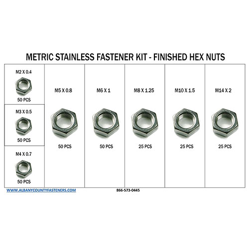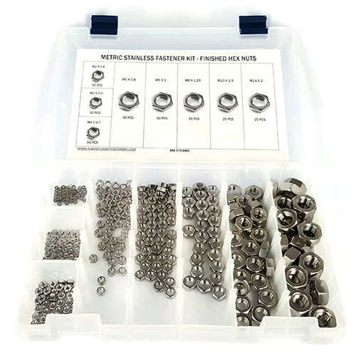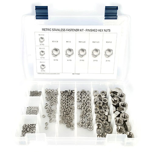 This fastener kit features an assorted, metric sized, A2 Stainless Steel finished hex nut size run in a durable and organized plastic compartment box.