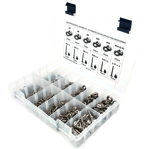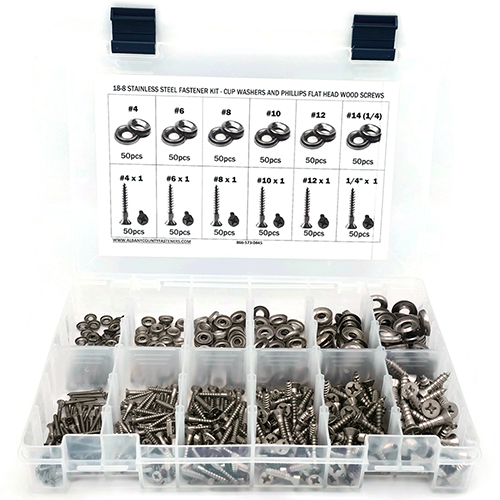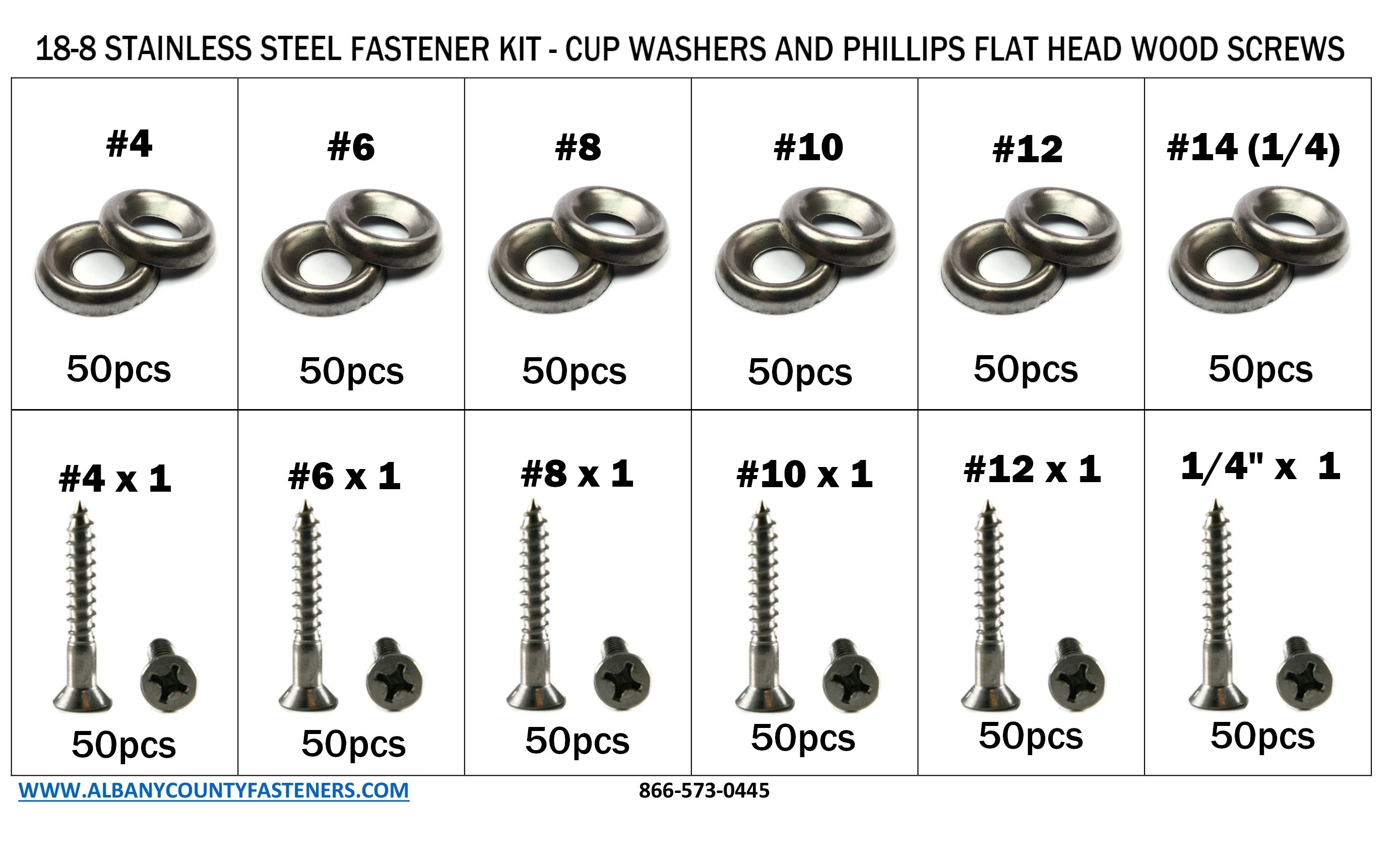 601 piece Stainless Steel Phillips Flat Head Wood Screw Kit with Cup Washers Easy Reorder Sheet