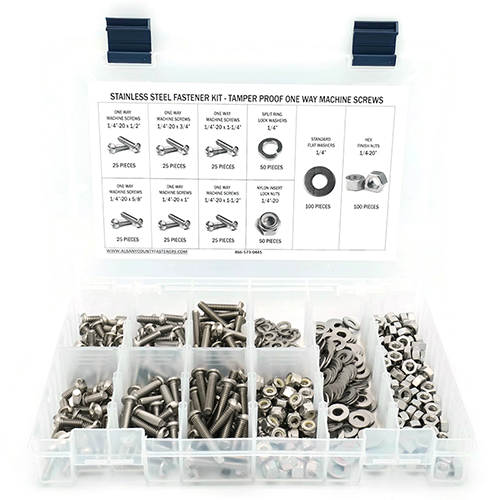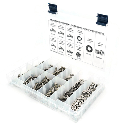 1/4"-20 Stainless Steel Tamper Proof One Way Machine Screws with matching Hex Nuts, Lock Nuts, Washers and Lock Washers all in one convenient kit.