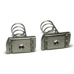 Spring channel nuts drop into the channel and are held in place by a spring for one-handed assembly. Choose the thread to match your hardware, for example 1/4-20, 5/16-18, or 3/8-16. Use the spring length that matches your channel depth.
