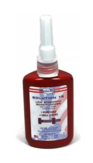 Removable low strength threadlocker MRO solution 15 is used for locking or sealing fastener assemblies on small fasteners less than 1/4" in diameter. This purple solution prevents accidental loosening of the parts. Disassembly is possible with the use of hand tools.