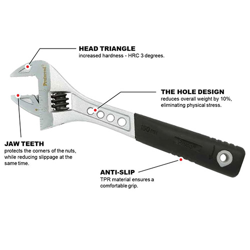 Tiger Paw Adjustable Wrenches are a fresh look on a popular tool. The Tiger's Paw adjustable wrenches have holes in the handle. These holes remove 10% of the overall weight from the wrench, which reduces user fatigue. The Tiger's Paw also has a head triangle which increases the hardness of the wrench for a better hold.